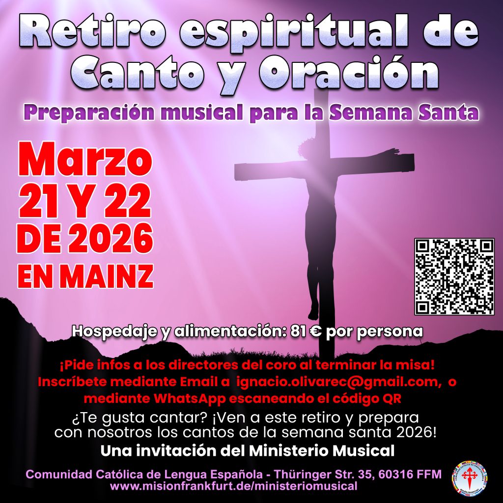 ¡Ha sido hermos empezar este tiempo de gracia del Adviento disfrutando de un extraordinario concierto! La Iglesia nos llama a prepararnos activamente para celebrar el misterio de la Navidad, y… El sábado 7.12.24 tuvo lugar en nuestra iglesia la Meditación Musical de Adviento, anhelando que la música y el canto despertaran al Niño que ha venido para nacer en nuestros… Con gran alegría pudimos celebrar esta misa con un toque diferente, propio de Andalucía, en honor a nuestra Madre, la Virgen María, bajo la advocación de la Virgen del Rocío…. Entre los medios más hermosos y poderosos de evangelización destacan el canto y la música. Es por eso que la Delegación Nacional de Misiones Católicas de Lengua Española en Alemania cuenta con un ministerio musical al servicio… El 13, 14 y 15 de octubre de 2023 tuvo lugar en Frankfurt un evento extraordinario en el que más de 80 personas tuvieron la oportunidad de aprender, fortalecer la… Se trata de una celebración llena de voces e idiomas distintos, en el marco de la fiesta de Pentecostés. Se celebra cada año en las vísperas de la fiesta de… El domingo 12 de febrero recibimos la visita del Ministerio Musical de Mannheim. Honrosa visita del ministerio musical de Mannheim 12.02.2023 El ministerio de la música es un llamado hecho… El jueves 1 Diciembre de 2022 nuestro ministerio musical estuvo invitado a participar en los conciertos navideños que organiza nuestro Bezirkskantor, Peter Reulein, en la iglesia Liebfrauen. Se trata de… Cada año, el último fin de semana de noviembre, el departamento de música popular de nuestra diócesis de Limburg organiza un retiro de formación musical y litúrgica en Kirchhähr para…Concierto de Adviento